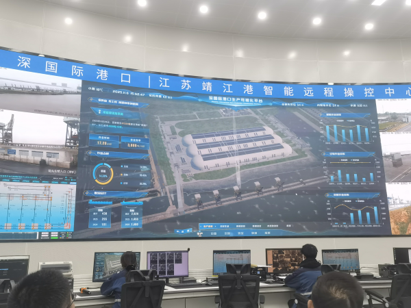 隨后,調(diào)研組前往深國際靖江港,重點(diǎn)調(diào)研其在綠色、智慧、安全等方面的建設(shè)成果。該碼頭擁有岸線長度1090m,2個(gè)10萬噸(兼靠15萬噸)泊位和5個(gè)3000噸級(jí)內(nèi)港池泊位,陸域占地45萬平方米,年設(shè)計(jì)吞吐量3480萬噸。在智能遠(yuǎn)程控制中心,工作人員現(xiàn)場演示了全流程智能化管控系統(tǒng),實(shí)時(shí)呈現(xiàn)現(xiàn)場作業(yè)、裝卸設(shè)備及貨物動(dòng)態(tài),展現(xiàn)了高度集成與智能化的港口運(yùn)營管理模式。